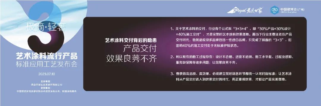此次發(fā)布會緊扣行業(yè)內(nèi)的熱點問題,從藝術(shù)涂料消費投訴問題入手,深入剖析了藝術(shù)涂料交付背后的隱患,指出產(chǎn)品交付效果良莠不齊的問題,并針對產(chǎn)品工藝現(xiàn)狀指出了缺失標準工藝導致的不良后果,引發(fā)了與會者對產(chǎn)品工藝的關(guān)注和思考。與此同時,發(fā)布會也強調(diào)了建立標準工藝優(yōu)勢與重要性,為推動行業(yè)發(fā)展提供了方向。