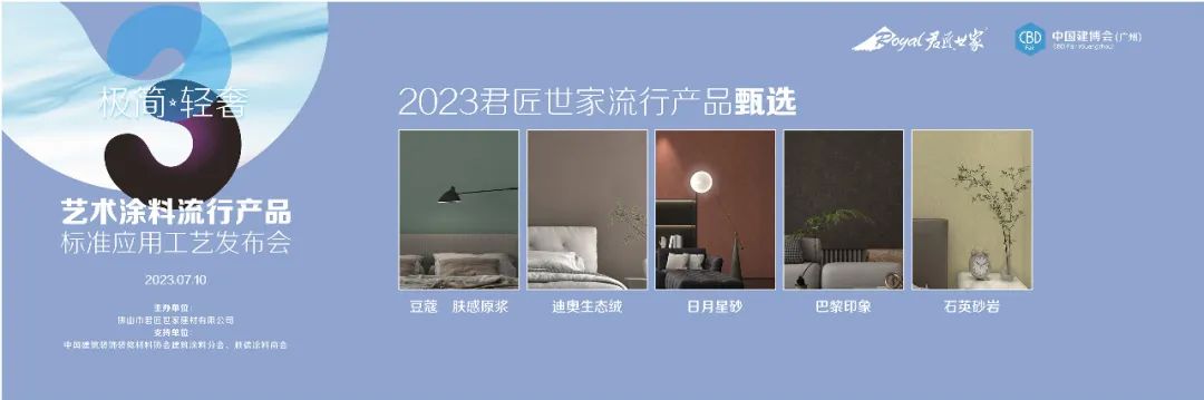 2023君匠世家臻選三大類流行產(chǎn)品,引領簡奢大美風尚:1.藝術(shù)平涂類:豆蔻膚感原漿;2.珠光肌理類:迪奧生態(tài)絨;3.質(zhì)感批刮類:巴黎印象、日月星沙、石英砂巖。