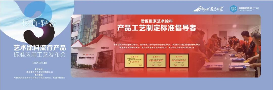 7月10日,在中國建博會(廣州)上,君匠世家隆重的舉辦了2023藝術(shù)涂料流行產(chǎn)品標準應用工藝發(fā)布會。此次發(fā)布會得到了多方的支持與關(guān)注,與會的領導嘉賓有中國建筑裝飾裝修材料協(xié)會建筑涂料分會副秘書長賢冬先生、順德涂料商會會長羅宇先生、順德涂料商會榮譽會長胡景釗先生、君匠世家藝術(shù)涂料總經(jīng)理李東明先生等,領導嘉賓與現(xiàn)場觀眾一道,共同見證君匠世家藝術(shù)涂料的年度匠心之舉,以及一同探索藝術(shù)涂料行業(yè)產(chǎn)品標準應用工藝的未來之路。