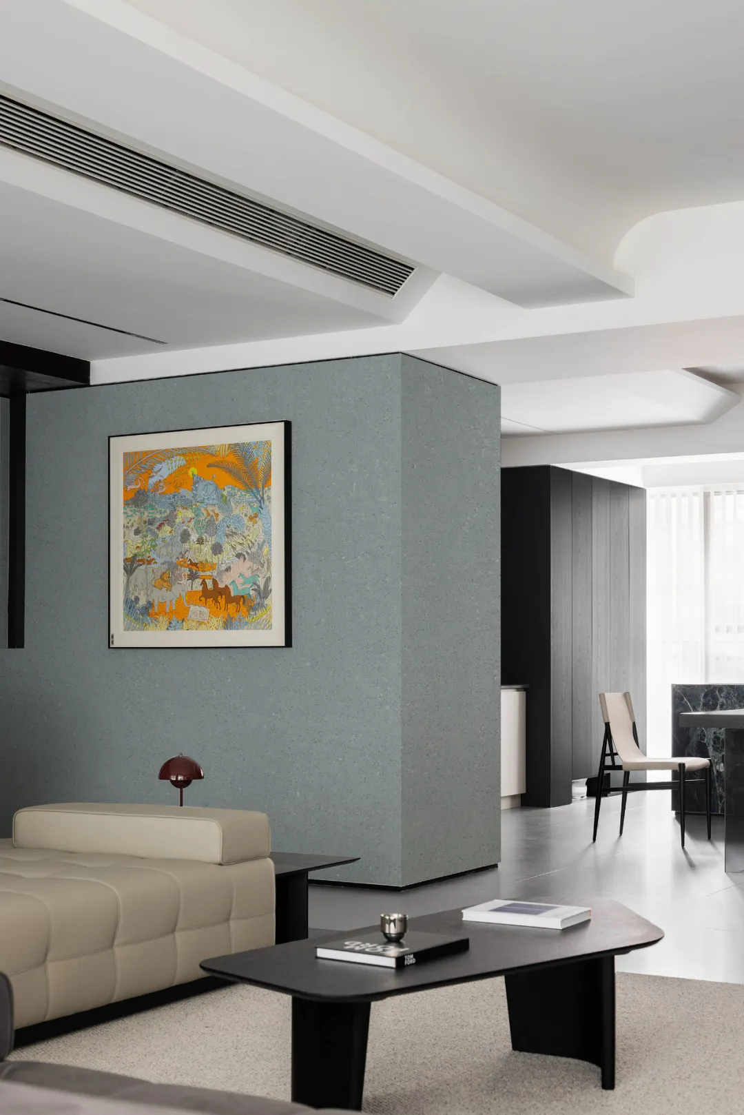 低飽和度中性色與局部亮色點綴的完美結(jié)合。星河巖2501號高級灰墻面與黑色家具、米色沙發(fā)構(gòu)成柔和的中性色基底,墻上的藝術(shù)畫以亮色打破沉悶,質(zhì)感細膩且粗獷的星河巖完美契合現(xiàn)代極簡風(fēng)格的“簡潔、純粹”。